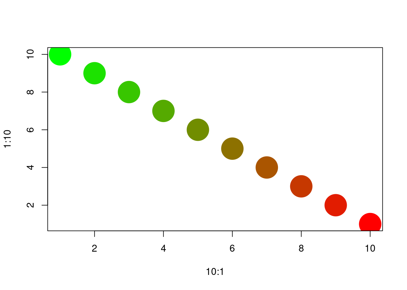 plot(x=10:1, y=1:10, pch=19, cex=5, col=palf(10))