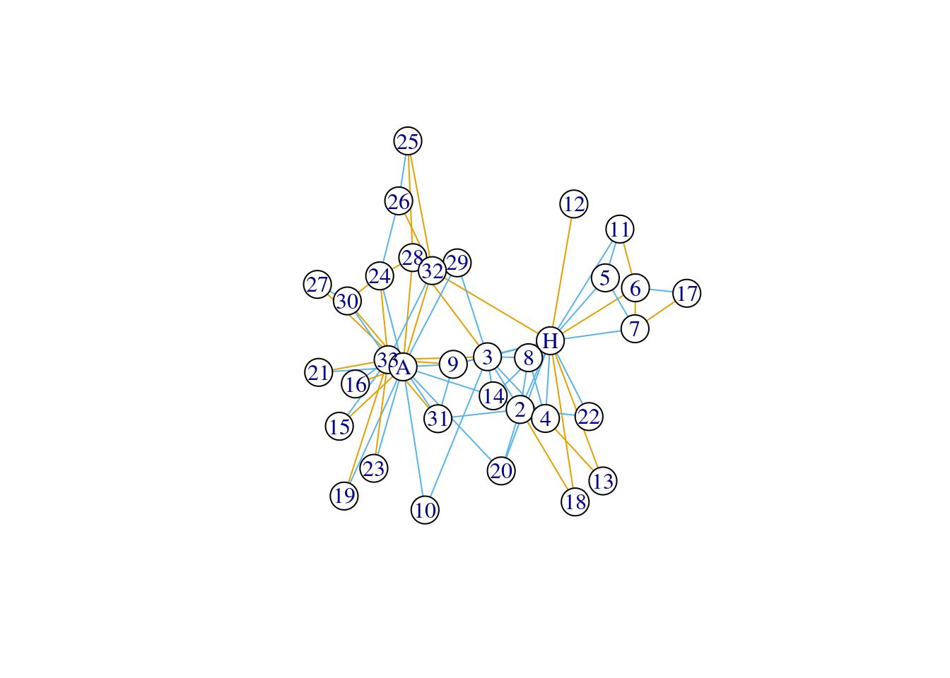 factor(E(karate)$edge_type) |> levels() # this tells you the ordering of the levels so you can tell that red = different and blue = same ## [1] "different" "same"