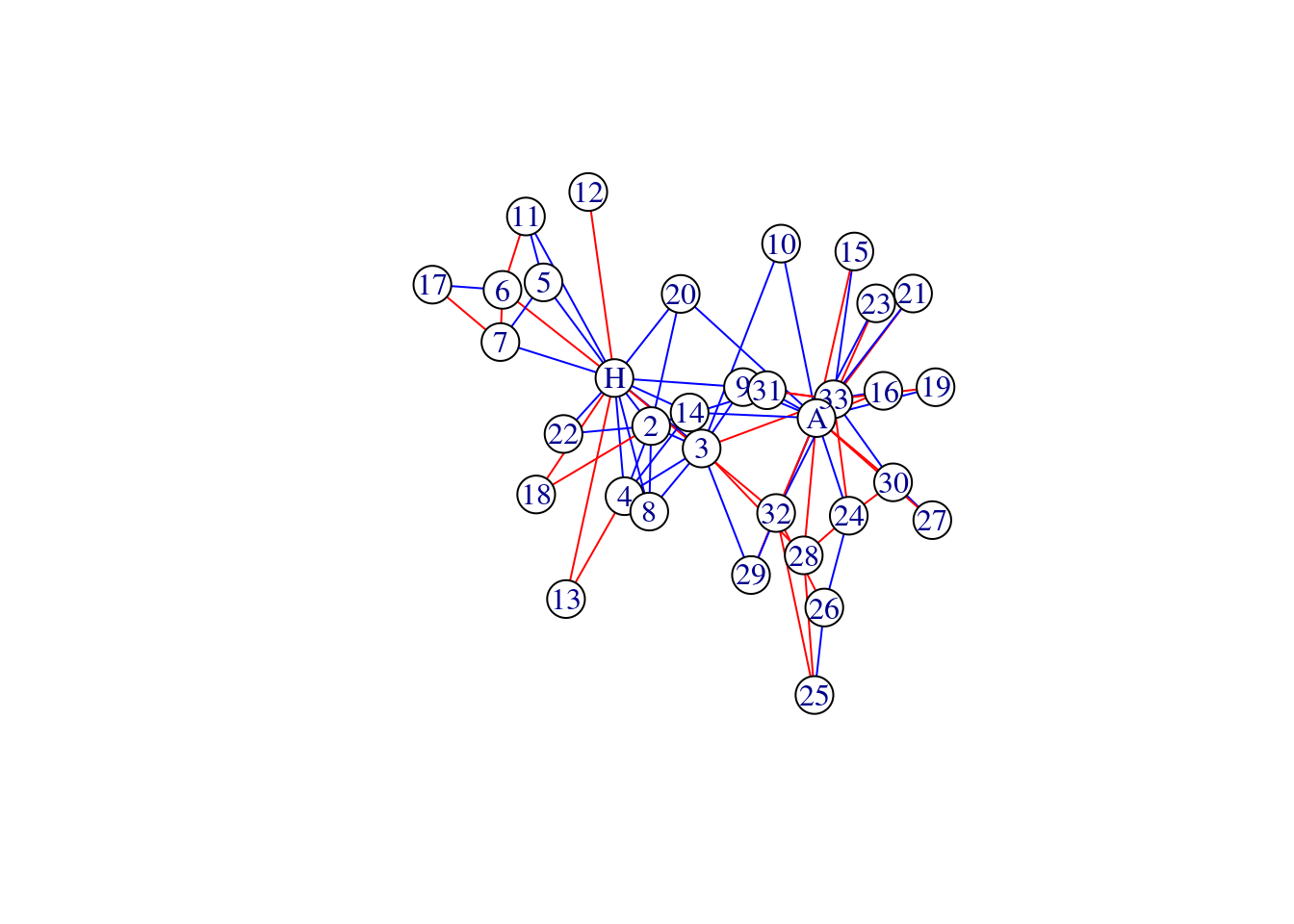 plot(karate, vertex.color = 'white', edge.color = c('red', 'blue')[factor(E(karate)$edge_type)]) # specifying your own colors